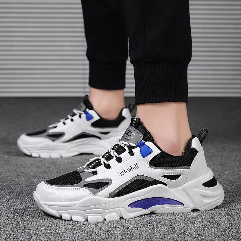 These trendy chunky sneakers feature a bold black-and-white color combination with striking blue accents, delivering a modern urban fashion vibe. Made with high-quality breathable mesh and synthetic leather materials, the upper ensures dry, comfortable wear while maintaining durability. The thick rubber outsole provides excellent anti-slip performance and cushioning, offering stable support and comfort for walking or sports activities. Perfect for daily commutes, workouts, or street-style fashion, these sneakers are the ideal choice for those seeking both style and functionality.