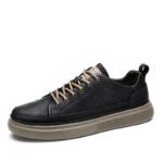 These black leather casual shoes combine elegance and functionality, featuring a classic design and refined materials, making them perfect for daily commutes and casual occasions. The premium synthetic leather upper delivers a smooth texture, is easy to clean, and offers long-lasting durability. Brown lace accents add a vintage touch, perfectly complementing the earth-tone outsole. The minimalist yet stylish design is paired with a lightweight, high-elastic sole for excellent cushioning and long-term comfort.