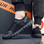 These stylish black sport casual shoes combine minimalist design with practical functionality, perfect for everyday wear and light activity. The upper features high-quality breathable knit fabric, ensuring a lightweight and comfortable fit while keeping your feet cool and dry. Enhanced with a reinforced protective toe and textured side panel design, these shoes offer both style and functionality. The durable rubber sole provides excellent anti-slip performance and superior traction, delivering a steady stride. With a flexible and lightweight structure, these sneakers guarantee all-day comfort.
