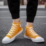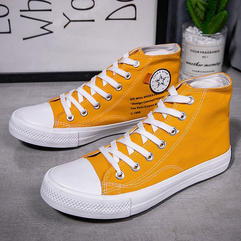 These vibrant yellow high-top canvas shoes combine style and comfort, making them a must-have for fashion enthusiasts. Crafted from high-quality canvas, the upper provides excellent breathability for long-lasting comfort. The classic high-top design not only offers extra ankle support but also adds a pop of lively color to your overall outfit. Featuring a durable, non-slip rubber sole, these shoes are perfect for daily wear or outdoor activities. Whether paired with jeans or casual shorts, this pair effortlessly complements any occasion, showcasing your unique personality.