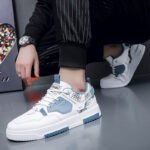 These stylish casual sports shoes combine modern trends with superior comfort. Featuring a clean white base accented by refreshing blue panels and unique graphic patterns, they showcase both individuality and contemporary style. Made with premium leather materials and a durable, anti-slip rubber sole, these sneakers ensure all-day comfort and stability, perfect for daily outings, sports, or casual occasions.