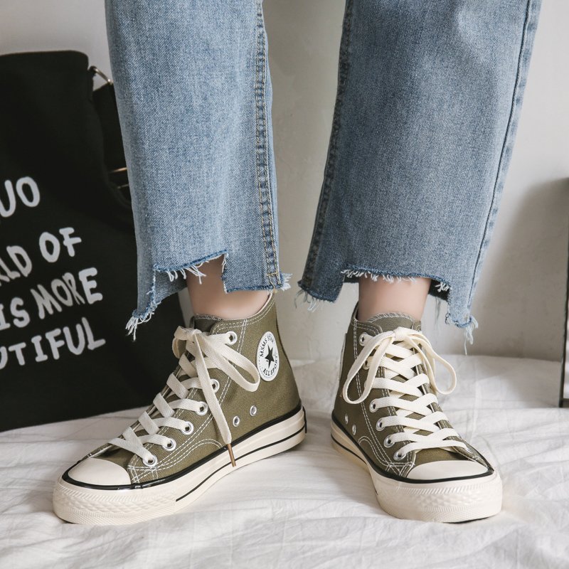 Combining retro aesthetics with modern comfort, these army green high-top canvas shoes are durable, stylish, and versatile. Elevate your daily style with this essential pair of sneakers.