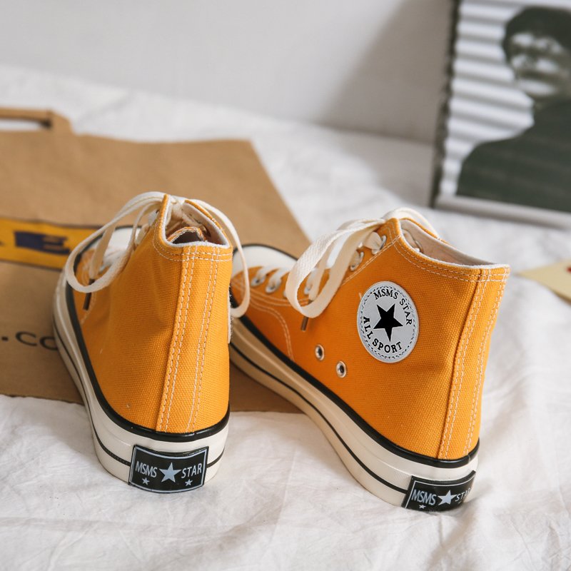 Combining retro aesthetics with modern comfort, these yellow high-top canvas shoes are durable, stylish, and versatile. Elevate your daily style with this essential pair of sneakers.