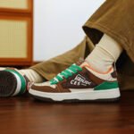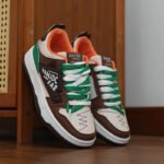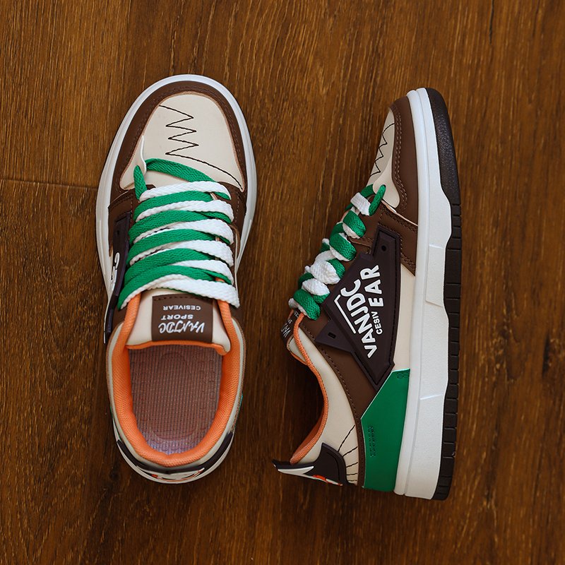 This trendy and stylish sneaker features a unique color-blocking design, with brown and beige as the main tones accented by striking green details, creating a distinctive and eye-catching look. The upper is made of high-quality synthetic materials, offering both breathability and durability to ensure all-day comfort. The thickened sole provides excellent cushioning and enhanced support, making it perfect for everyday wear or light exercise. The side of the shoe features personalized logo designs and textured details, adding a touch of street fashion. Whether paired with casual or athletic wear, these sneakers will make you stand out in the crowd!