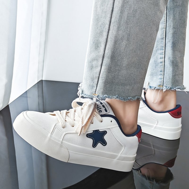 These stylish low-top canvas shoes feature a simple yet energetic design, perfect for those who value comfort and fashion. The soft canvas upper is breathable and lightweight, with a standout blue star decoration and a red heel accent that adds personality and a vibrant touch, making it easy to create a trendy look.